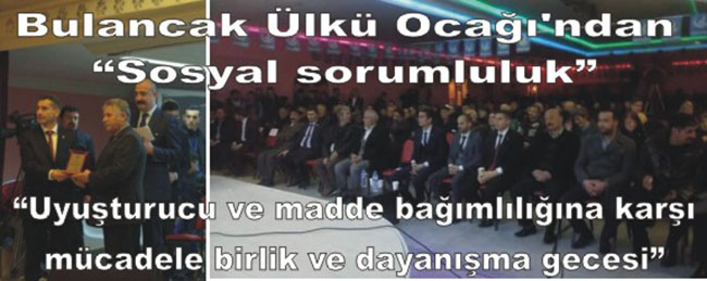Ülkü Ocakları Bulancak İlçe Başkanlığının Düzenlemiş olduğu Uyuşturucu ve Madde Bağımlılığına karşı mücadele birlik ve beraberlik gecesi düzenledi. Gecede uyuşturucu ve madde bağımlılığına karşı kısa bir seminer verildikten sonra yerel sanatçı kemençe virtüözü Ertuğrul Alim, Ülkü Ocakları Genel Merkez sanatçıları Osman Öztunç ve Gürbüz Gözümün sahne aldığı programa kalabalık ve yoğun ilgi ve büyük bir beğeniyle izlendi. Ülkü Ocakları Bulancak İlçe Başkanı Öner Pekdemir yaptığı konuşmada ise şunları söyledi. Öner, "Damarlarındaki asil kanı kirleten uyuşturucuyla mücadelemiz sürecektir" dedi. Ülkü Ocakları Giresun İl Başkanlığı çevre il Ocaklar ilçe Ocaklar MHP İl Başkanı Müjdat Öz ve Yönetimi MHP Doğankent ilçe Başkanı Haşim Birol Tekin ve MHP il ve ilçe teşkilatları çeşitli STK'lar katıldılar. Program sırasında Kurulduğu Günden bu Yana Ülkü ocakları Bulancak ilçe Başkanlığını yapmış olduğu hikmetlerden dolayı Yılmaz Karabaş’a Ülkü ocakları Bulancak ilçe başkanı Öner Pekdemir tarafından plaket takdim edildi.