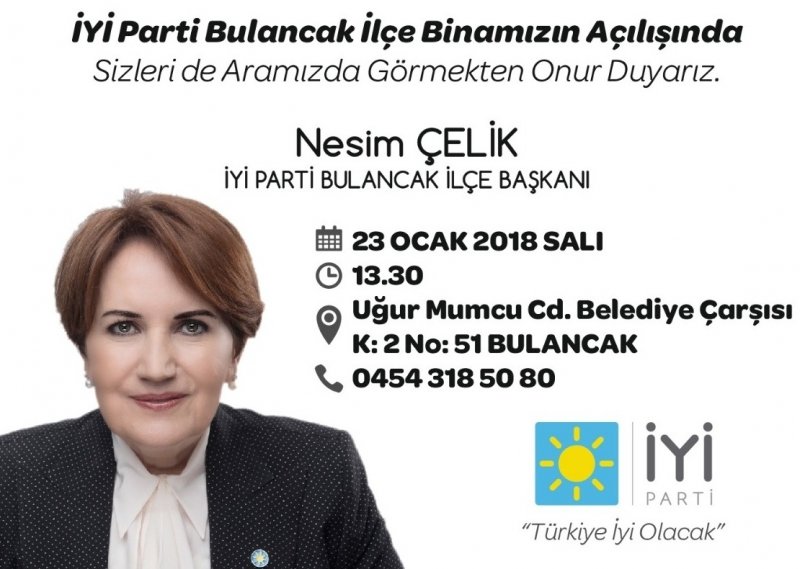 Bulancak İYİ Parti İlçe Başkanı Nesim Çelik, İYİ Parti Genel Başkanı Meral Akşener’ın dediği gibi “Bu bir iktidar yürüyüşüdür, Bu insanımız için, bir özgürlük yürüyüşüdür, Bu devletimiz için, bir itibar yürüyüşüdür, Bu milletimiz için, bir demokrasi yürüyüşüdür, Bu güçlü Türkiye yürüyüşüdür” sözleri artık Bulancak ve Giresun de yüksek sesle dile getirilecek” dedi. İYİ Parti İlçe Başkanı Çelik, 23 Ocak 2018 Salı günü Bulancak İhsaniye Mahallesi Uğur Mumcu Caddesi Belediye Çarşısı 2. Katta ki açılışına tüm Bulancak ve bölge halkının davet etti.