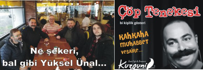 24 Ocak'ta Bulancak 75 Yıl Halk Kütüphanesi Tiyatro Salonu’nda tiyatro severlerle buluşacak olan Muhteşem Yüzyıl Dizisi'nde Şeker Ağa’sı Tiyatro ve Sinema Sanatçısı insan Yüksel Ünal havanın kapalı olmasına rağmen bölgemizi ve insanlarını çok sevdiğini söyledi. Tiyatro ve Sinema Sanatçısı Ünal, “ Bulancak’tan çok bahsediliyordu gerçekten de mükemmel bir yermiş Bulancak. Bu akşam ki “Çöp Tenekesi” oyunumda karşı karşıya olmanın heyecanı içindeyim. Aynı şekilde yarın 25 Ocak’ta Giresun ve 26 Ocak’ta Görele’de bölge halkıyla buluşacak olmamıza vesile olan Bulancaklı tiyatro sanatçısı ve tiyatro sanatcısı dosttu Bülent Mutlu kardeşimize sizlerin huzurunda teşekkür etmek istiyorum” dedi. 25 Ocak'ta Giresun ve son olarak 26 Ocak'ta Görele'de tek kişilik gösterisiyle tiyatro severlerin huzuruna çıkacak olan Muhteşem Yüzyıl Dizisi'nde Şeker Ağa’sı tiyatro ve sinema sanatçısı Yüksel Ünal’ın oyununa mutlaka katılmanız gerektiği vurgulandı. Karadeniz organizatörü Bülent Mutlu'nun talebi üzerine ilçemize ve bölgemizde bulunan Yüksel Ünal tek kişilik oyunun da yaşamından kesitler ve gözlemlediği olayları mizahi bir dilde seyirciye aktaracağı öğrenildi. Tiyatro severlerin bu akşam ki oyuna katılarak sahnede ki yerlerini alması istendi.