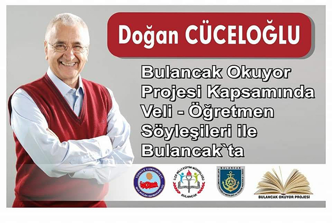 Bulancak Kaymakamlığı ve Bulancak İlçe Millî Eğitim Müdürlüğü himayesinde yürütülen "Bulancak Okuyor Projesi" kapsamında düzenlenecek 2 etkinlikle Prof. Dr. Doğan Cüceloğlu ’nu Bulancak'ta söyleşi yapmaya geliyor.