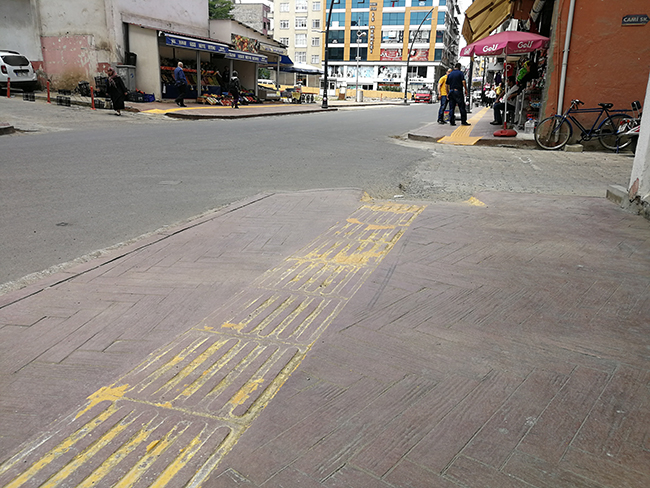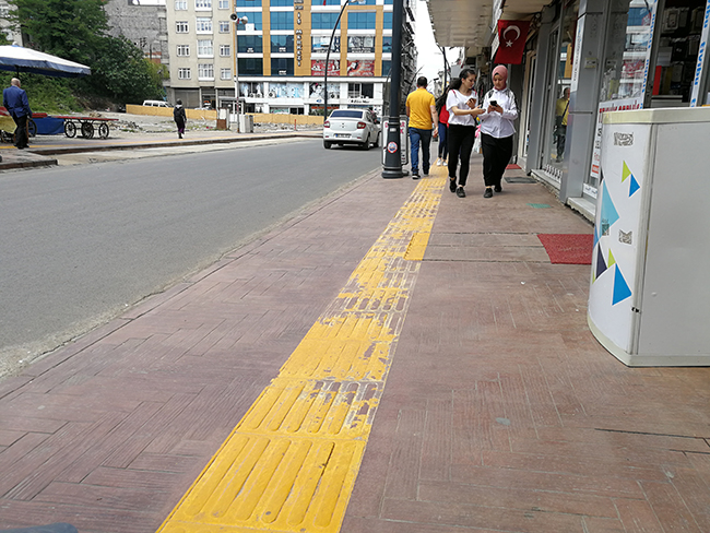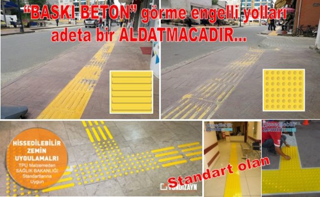 bulancakhaber.net’in görüntülediği daha iki üç gün önce yapılan ama boyası ve baskı beton ile yapılan kabartma görme engelli yolları milli servet kaybına yol açmakta ve yok olmaktadır. Hissedilebilir zemin, plastik ya da çelik malzemeden yapılmadığı için Bulancak’ta yapılanların yaptık oldu demeten öte bir çalışma değildir.