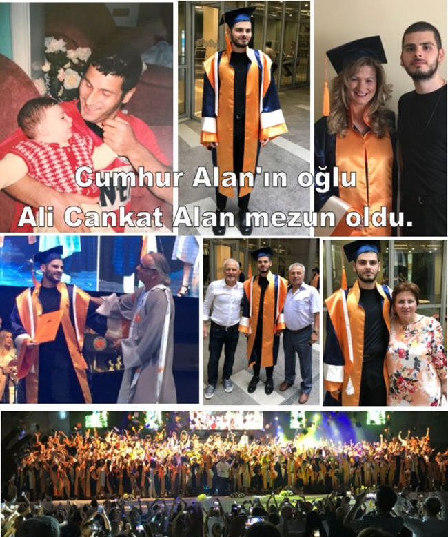 O günlerde 6 aylık olan ve daha oğlunun kokusuna doyamadan aramızdan ayrılan çok sevdiğimiz arkadaşımız sporcumuz Bulancaklı baba Cumhur Alan’ın oğlu Cankat Alan bu günlere buruk bir sevinç yaşıyor. Anne Hakimiyet-i Milliye İlkokulu’nda öğretmen olarak hayatına devam ederken çocukları Ali Cankat Alan’ı en iyi ve en güzel şekilde yetiştirdiği, burslu olarak eğitimini İzmir Ekonomi Üniversitesi’nden başarıyla tamamladığını öğrendik. Ali Cankat Alan İzmir Ekonomi Üniversitesi Endüstriyel Tasarım Bölüm Başkanı A. Can Özcan’ın elinden diplomasını aldı. 21 Şubat 1997 Erzincanspor tarihinin en acı günü olarak hafızalarda yer edinen olay sonrasında 6 aylık olan Cumhur Alan’ın oğlu Ali Cankat Alan bu gün 21 yaşında Üniversiteden mezun olmasının büyük mutluluğunu yaşandığına tanık olduk. bulancakhaber.net’in takip ettiği ve bu günlerde mezun olan Cankat’ı bu özel ve önemli gününde amcaları Hüseyin, İsmail Alan ile halaları Hanife Karadeniz yalnız bırakmadıkları objektiflere böyle yansıdı.