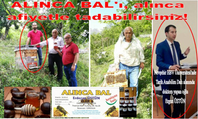 Bulancak Bal Üreticileri Birliği Başkanı Erdoğan Üstün’ün Nevşehir HBV Üniversitesi’nde Tarih Anabilim Dalı alanında doktora yapan oğlu Ergun ÜSTÜN ile birlikte sizlere kaliteli ve lezzetli üstün bir bal hazırladık.