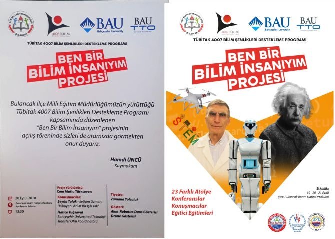 Bulancak Kaymakamlığı neslin de İlçe Milli Eğitim Müdürlüğü’nün yürüttüğü “BEN BİR BİLİM İNSANIYIM PROJESİ” 20 Eylül 2018 Perşembe günü Bulancak İmam Hatip Ortaokulu konferans salonunda saat;13.30 da gerçekleştirilecektir. “BEN BİR BİLİM İNSANIYIM PROJESİ” yürütücüsü Cem Mutlu Türkseven, Konuşmacılar; Şeyda Taluk (İletişim Uzmanı hikâyeni anlat bir ışık yak) Hatice Tuğsavul (Bahçeşehir Üniversitesi Teknoloji Transfer Ofisi Koordinatörü ) ve ardından Tiyatro; Zamana Yolculuk ile Gösteri; Akın Robotics Dans Gösterisi ile son olarak Drone Gösterisi ile son bulacak.