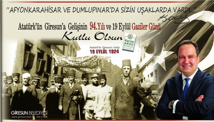 Giresun Belediye Başkanı Kerim Aksu, Büyük Önder Mustafa Kemal Atatürk’e TBMM tarafından Gazilik unvanının verilişinin 97. ve Gazi Mustafa Kemal Atatürk’ün Giresun’a gelişinin 94. Yıldönümü nedeniyle bir mesaj yayınladı.