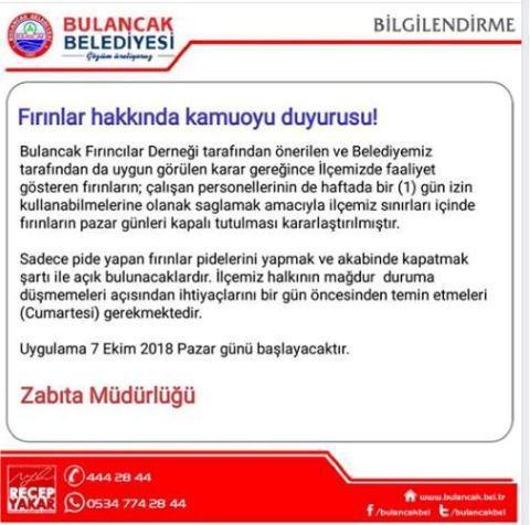Bulancak Fırıncılar Derneği tarafından önerilen ve Belediyemiz tarafından da uygun görülen karar gereğince ilçemizde faaliyet gösteren fırınların; çalışan personellerinin de haftada bir (1) gün izin kullanabilmelerine olarak sağlamak amacıyla ilçemiz sınırları içerisinde fırınların pazar günleri kapalı tutulması kararlaştırılmıştır.