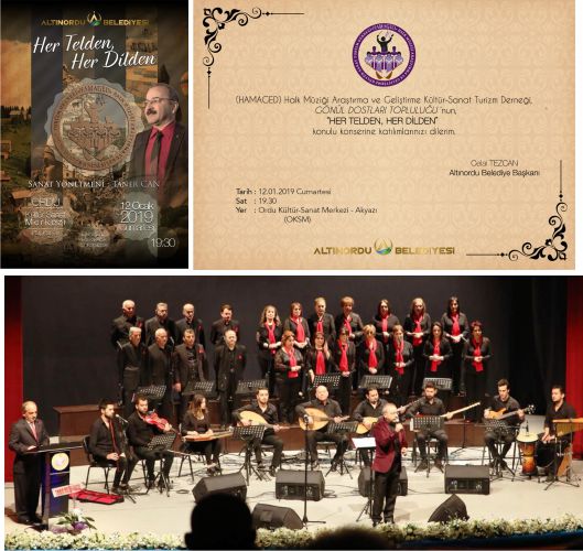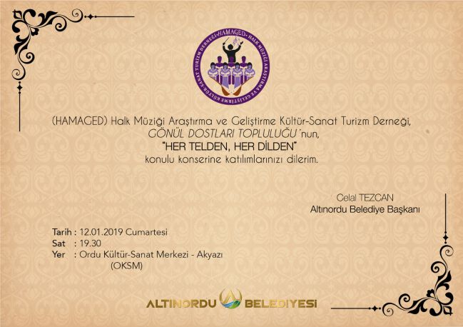 HAMAGED, Halk Müziği Araştırma ve Geliştirme Kültür Sanat Turizm Derneği, Gönül Dostları Topluluğu’nun “Her Telden Her Dilden” konserine 12 Ocak 2019 Cumartesi günü Saat;19.30’da Ordu Kültür Sanat Merkezi’nde gerçekleştirilecek.