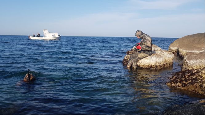 Zıpkınla balık işini hem hobi hem de ev ekonomisine ek gelir olarak yapan iki kardeş dikkatlerimizden kaçmadı.
