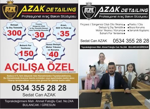 Bulancak Toprak Değirmeni Mahallesi Ahmet Fatoğlu Caddesi üzerinde AZAK DETAILING Profesyonel Araç Bakım Stüdyosu açıldı.