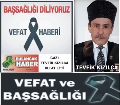 Şerife Kızılca’nın eşi; Şükrü Kızılca, Mustafa Kızılca, Sevinç Yılmaz ve Nuray Aydın’ın babası; İlçemiz esnaflarından Camcı Rasim Aydın’ın kayınpederi GAZİ TEVFİK KIZILCA vefatı ailesini ve sevenleri yasa boğdu.