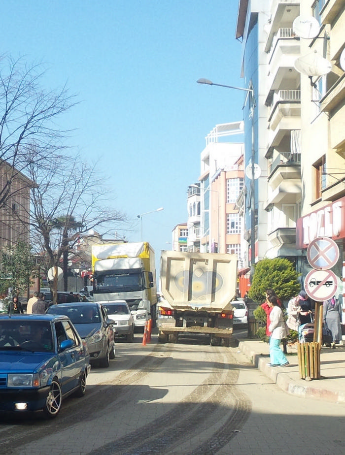 Bölgemizin ve özellikle Bulancak’ın önemli sorunlarının başında gelen ilçe trafik sorunu içinden çıkılmaz hal alırken, objektiflerimize Atatürk Caddesi’nde yansıyan, levhaya inat kamyonların, tırların dolaştığı trafiğin gerçek yüzünü görüntüledik. Gidişli gelişli yolda aynı anda iki kamyon trafikte bu kadar rahat dolaşırlarken görüntülendi. Atatürk Caddesi üzerinde çift yönlü olan cadde de araçlar ilerlemekte zor anlar yaşarken, hatta yol kenarında kamyon giremez levhasına inat uyarı levhasını dikkate almadan ilerleyen kamyonlar şehir içinde adeta taksi gibi dolaştıkları görüldü. Bu durum gün içerisinde kamyon girişi yasak olsa bile her kez istediği gibi kamyonla şehir içinde gezerken objektiflerimize sadece Bulancak Atatürk Caddesi’nin deki görüntü takıldı. Bulancak genelinde bazı alanlarda tırların yük boşaltmak için fortip bile kullandığı görüldü. Bulancak Ballıca Mahallesi, Cemal Gürsel Caddesi ve birçok alanda kamyonlar kontrolsüz bir şekilde çalıştığı görülürken bir de keyfi olarak kişiler şehir merkezinde ana yolu bile kapatmasına bir türlü anlam veremedi. Bu konuda belediye ve emniyetin kent içindeki hatalı parklar konusunda ve kamyon konusunda daha duyarlı olmasını istediler. ayrıca yol kenarında ki kamyon giremez levhası,levha kimin umrunda dedirtti