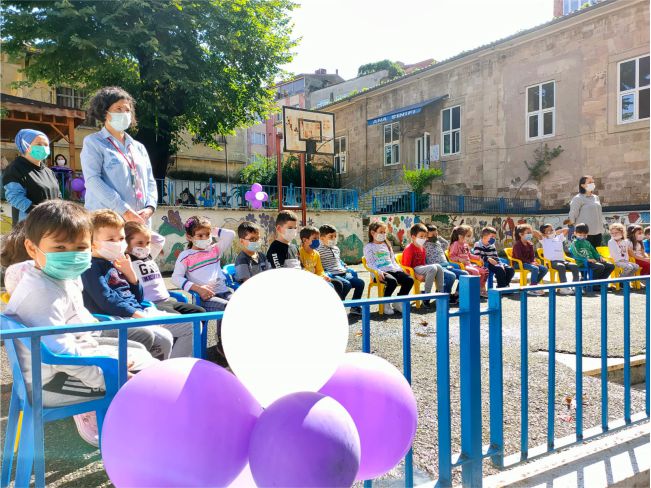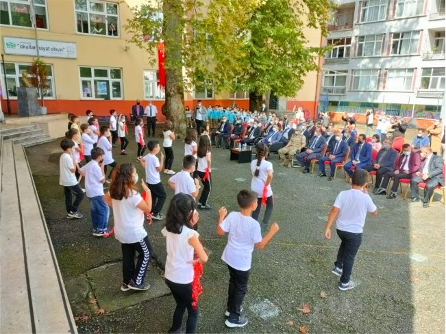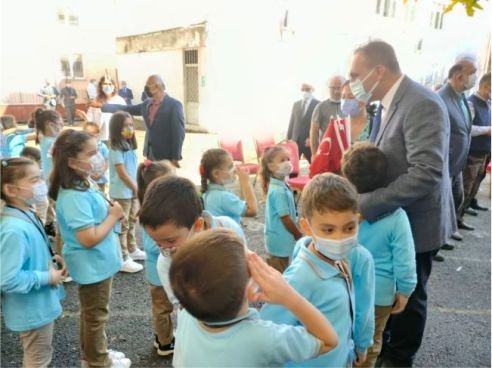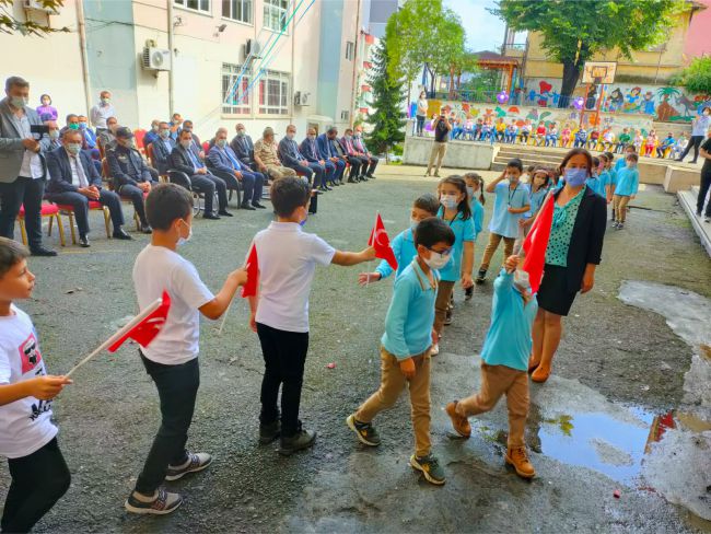 Okulun 1. Sınıf öğrencilerine 4. Sınıf öğrencileri her bir öğrenciye “Türk bayrağı” sunarak “YAŞASIN OKULUMUZ” şarkısıyla okula girişleri gösterildi.