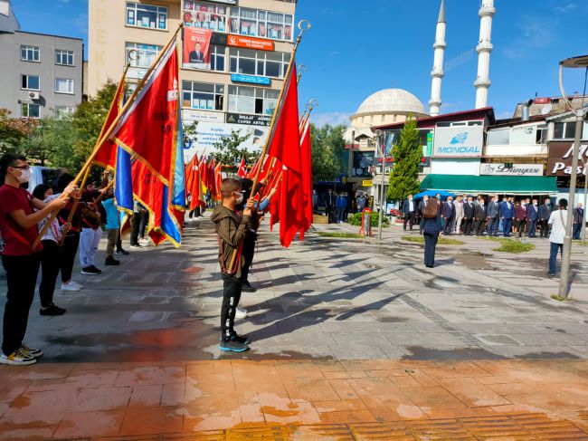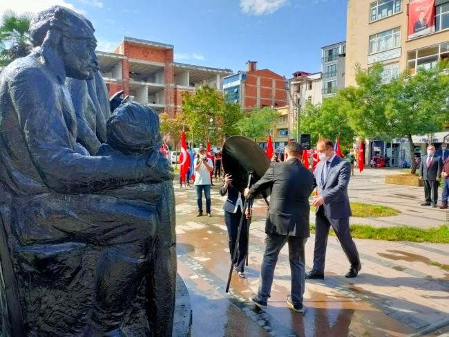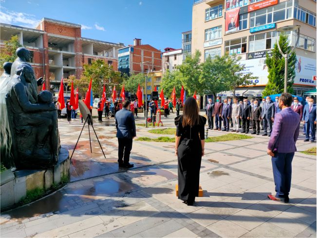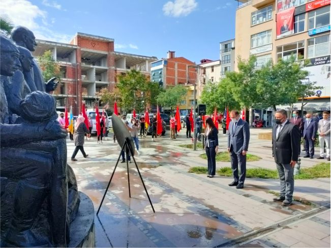 Milli Eğitim Müdürü Şenel Bulut ile birlikte Barbaros İlkokulu Sınıf Öğretmeni Sezgin Cindemir ve İngilizce Öğretmeni Nafiye Bayır Tatar ile birlikte Atatürk Anıtı’na çelenk koyması ile başladı.