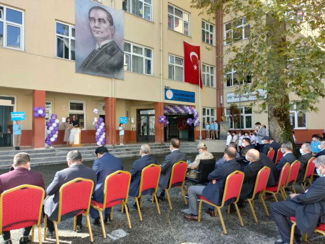 “İLKÖĞRETİM HAFTASI” çelenk sunma töreni Barbaros İlkokulu Anasınıfı Pelin Aksu’nun sunumu ve ardından Saygı duruşu ve Mehmet Akif Ersoy Orta Okulu Müzik Öğretmeni Hakkı Işıkdemir’in yönetiminde İstiklal Marşımızın okunmasıyla devam etti.